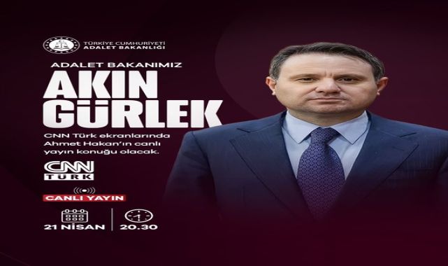 Adalet Bakanı Gürlek, 21 Nisan 2026 Salı günü saat 20.30'da CNN Türk'te Ahmet Hakan'ın canlı yayın konuğu olacak. Programda, güncel adalet konularına ilişkin önemli açıklamalarda bulunması bekleniyor.