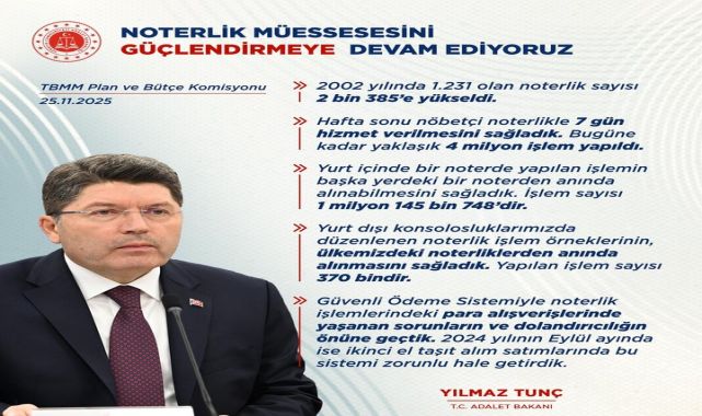 Adalet Bakanı Yılmaz Tunç, TBMM Plan ve Bütçe Komisyonu'nda yaptığı açıklamada noterliklerin adalet hizmetlerinin önemli birer parçası olduğunu belirtti. Bakan Tunç, 2026 yılı bütçe görüşmeleri vesilesiyle noterliklerin Adalet Bakanlığı'nın hizmet ağındaki rolünü vurguladı.