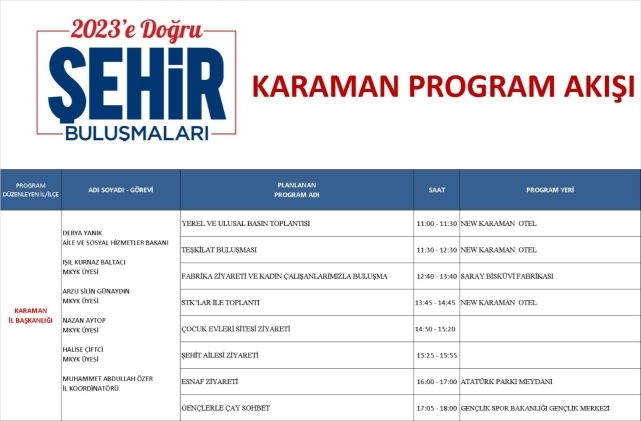 Başkan Çağlayan yaptığı açıklamada: “2023’e Doğru Şehir Buluşmaları" programımıza 8 Ekim Cumartesi günü Aile ve Sosyal Hizmetler Bakanımız Sayın Derya Yanık hanımefendi teşrif edecektir. Ayrıca düzenlenecek olan programa MKYK üyemiz Sn. Işıl Kurnaz Baltacı, MKYK üyemiz Sn. Arzu Silin Günaydın, MKYK üyemiz Sn. Nazan Aytop ve MKYK üyemiz Sn. Halise Çiftçi de katılım sağlayacak olup ilimizde yapılacak olan programımıza eş zamanlı olarak Merkez ilçemizde Konya Milletvekilimiz Sn. Ahmet Sorgun, Kazımkarabekir ilçemizde Antalya milletvekilimiz Sn. Tuba Vural Çokal, Ayrancı ilçemizde Konya milletvekilimiz Sn. Tahir Akyürek, Ermenek ilçemizde Antalya milletvekilimiz Sn. İbrahim Aydın, Başyayla ilçemizde Antalya milletvekilimiz Sn. Kemal Çelik, Sarıveliler ilçemizde MKYK üyemiz, önceki dönem İstanbul milletvekilimiz Hasan Sert iştirak edeceklerdir.” bilgisini paylaştı.Aile ve Sosyal Hizmetler Bakanı Derya Yanık'ın Karaman Programı Aile ve Sosyal Hizmetler Bakanı Derya Yanık'ın 8 Ekim Cumartesi günü Karaman'da gerçekleştireceği programın detayları şu şekilde: Yerel ve Ulusal Basın Toplantısı - New Karaman Otel - 11.00-11.30