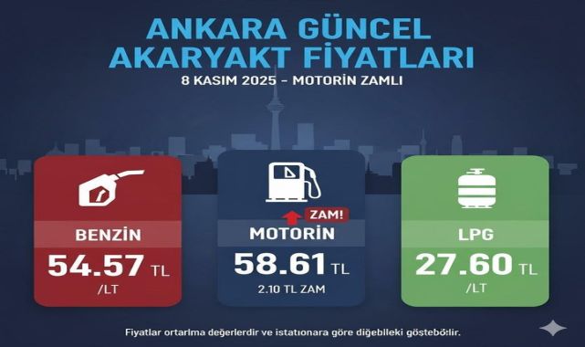 Ankara'da motorine 7 Kasım itibarıyla 2 lira 10 kuruş zam geldi. Zam sonrası motorinin litre fiyatı 58.61 TL'ye yükselirken, benzin ve LPG fiyatları da güncellendi.