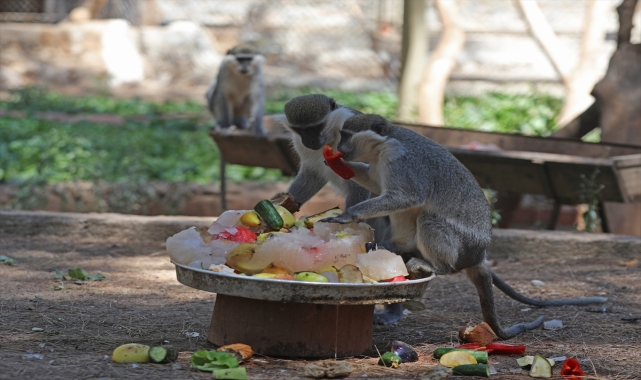 Antalya Hayvanat Bahçesi ve Doğa Parkı'ndaki sıcak hava nedeniyle hareket kabiliyetleri azalan hayvanlar, buzlu meyve kokteyli ve suyla serinletiliyor.Büyükşehir Belediyesinden yapılan açıklamaya göre, hayvanat bahçesindeki 144 türde 1500'ün üzerindeki hayvanın, aşırı hava sıcaklığından olumsuz etkilenmemesi için önlemler alınıyor.Hava sıcaklığının 40 derece seyrettiği kentte, görevliler hayvanat bahçesinde bunalan hayvanlar için buzlu ve soğuk meyve kokteylleri hazırladı.Her hayvanın beslenme alışkanlıklarına göre farklı meyvelerin konulduğu buz kalıplarındaki meyve kokteylleri, özellikle maymun türleri için lezzetli bir serinleme yaşatıyor. Doğal Yaşam Parkı'nda sıcaklara karşı ayrıca hayvanların kafeslere konulan fıskiye sistemi, havuzlar, koyu gölgelik alanlar aracılığıyla da serinlemeleri sağlanıyor.Açıklamada görüşlerine yer verilen Büyükşehir Belediyesi Doğal Yaşam Parkı Şube Müdürü Veteriner Hekim Aygül Arsun, hayvanların sağlığını korumak için her mevsim çeşitli imkanlar sağladıklarını bildirdi.Antalya'da etkisini gösteren sıcak hava nedeniyle hayvanlar için gerekli önlemleri aldıklarını vurgulayan Arsun, şunları ifade etti:"Sıcaklık stresi hayvanları olumsuz etkileyebiliyor. Sevimli dostlarımızı serinletmek için buz kalıplarındaki meyve kokteyllerini ikram ediyoruz. Ayrıca sıcaktan bunalan hayvanları fıskiye sistemiyle ıslatıyor ve serinlemelerini sağlıyoruz. Bazı türdeki hayvanların alışkanlıklarına göre çamur havuzları ve havuzlar ile serinletme işlemi yapılıyor."