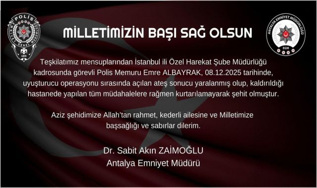 Antalya Emniyet Müdürlüğü, şehit olan emniyet mensupları için "Mekanı Cennet Ruhu Şad Olsun" başlıklı bir anma mesajı paylaştı. Mesajda, görev şehitleri rahmetle anıldı.