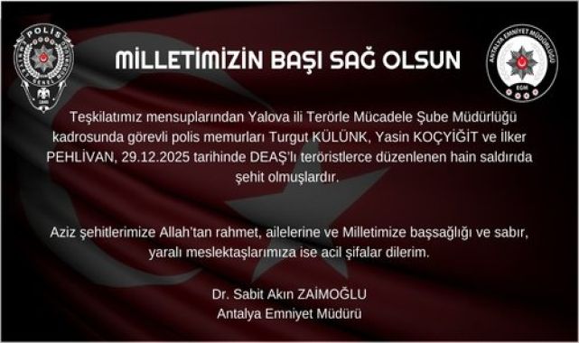 Antalya Emniyet Müdürlüğü, yayımladığı bir mesajla şehitleri anarak, ruhlarının şad olmasını diledi. Kurum, paylaştığı ifadelerle şehitlere olan saygısını gösterdi.