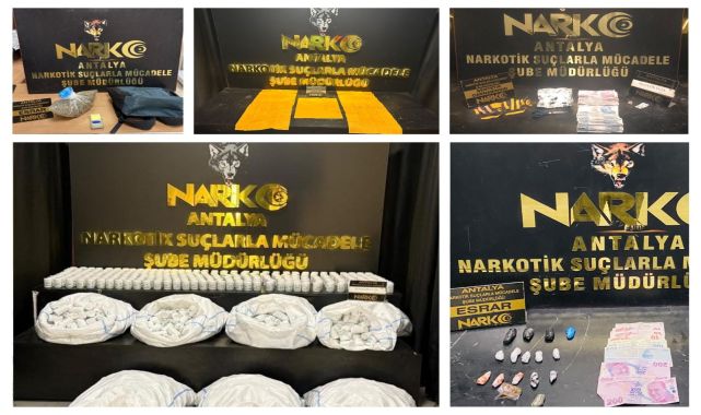 Antalya Emniyet Müdürlüğü Narkotik Suçlarla Mücadele Şube Müdürlüğü, geçtiğimiz hafta yaptığı operasyonlarda önemli başarılara imza attı. Yapılan açıklamaya göre, uyuşturucu ticareti, kullanımı ve bulundurulması suçlarından çok sayıda şüpheli yakalandı. Operasyonlarda ele geçirilen maddeler arasında sentetik ecza, esrar, metamfetamin, sentetik kannabinoid (A4), kokain ve eroin bulunuyor. Ayrıca, çok sayıda hassas terazi, ateşli silah ve fişek de ele geçirildi. Elde edilen bilgilere göre, suçtan elde edildiği değerlendirilen miktarda Türk Lirası da güvenlik güçleri tarafından tespit edildi.