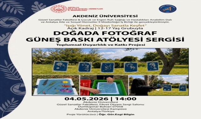 Antalya Aile ve Sosyal Hizmetler İl Müdürlüğü, Akdeniz Üniversitesi Güzel Sanatlar Fakültesi ve Çocuk ve Ergen Ruh Sağlığı ve Hastalıkları Anabilim Dalı iş birliğiyle anlamlı bir etkinliğe imza atıyor. "Işığı Yönet, Doğayı Sanatla Keşfet" temalı DOĞADA FOTOĞRAF GÜNEŞ BASKI ATÖLYESİ SERGİSİ düzenlenecek.Sergi, doğanın güzelliklerini sanat yoluyla keşfetmeyi amaçlıyor. Katılımcılar, fotoğrafçılık ve güneş baskı tekniklerini kullanarak doğadan ilham alan eserlerini sergileyecekler. Bu özel buluşma, sanatseverleri ve doğa tutkunlarını bir araya getirmeyi hedefliyor.