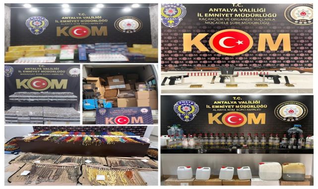 Antalya Emniyet Müdürlüğü birimlerince Kaçakçılık ve Organize Suçlarla Mücadele (KOM) kapsamında il genelinde gerçekleştirilen başarılı operasyonlar sonuç verdi. Son bir haftada yapılan çalışmalar neticesinde, çeşitli suçlardan toplamda çok sayıda şüpheli şahsa adli işlem yapıldı ve önemli miktarda kaçak malzeme ile ruhsatsız silah ele geçirildi.
