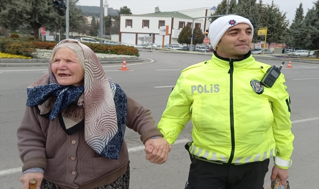 Kurtuluş Mahallesi Hamzalar kavşağında görev yapan trafik polisi, yolun karşısına geçmeye çalışan yaşlı bir kadın olduğunu fark etti. Polis yaşlı kadının elinden tutarak, yolun karşısına geçmesini sağladı.