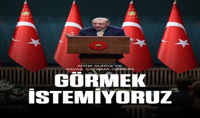 Türkiye Cumhurbaşkanı ve AK Parti Genel Başkanı Recep Tayyip Erdoğan, Türkiye'nin Suriye başta olmak üzere coğrafyasında artık savaş, çatışma ve gerilim istemediğini belirtti. Erdoğan, yer altı ve yer üstü zenginliklerinin savaş baronlarının cebine akmasına izin verilmemesi gerektiğini vurguladı.Erdoğan, kardeşlerin açlıkla, kıtlıkla ve yoksullukla mücadele ettiği bir ortamda,