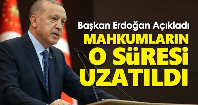 Başkan Erdoğan yaptığı açıklamada hükümlülerin izin sürelerinin uzatıldığını açıkladı.Başkan Erdoğan'ın açıklamalarından satır başları;* 31 Mayısta sona eren açık cezaevlerindeki hükümlülerin Kovid-19 izinlerini, 31 Temmuz 2023'e kadar uzatıyoruz.* Sayıları 550 bini bulan yoklama kaçağı gençlerimiz bedelli askerlikten faydalanabilecek.* Cumhurbaşkanlığı olarak İletişim Başkanlığımızın koordinasyonunda kapsamlı bir 100'üncü yıl kutlama programı oluşturduk.HÜKÜMLÜLERİN İZİNLERİ UZATILDIAçık cezaevlerindeki hükümlerinin Covid-19 izinlerini 31 Temmuz 2023 tarihine kadar uzatıyoruz.