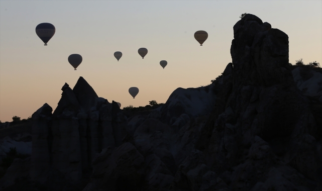 Tarihi, kültürel ve doğal zenginlikleri ile Türkiye'nin gözde turizm merkezi Kapadokya'da yüzlerce sıcak hava balonuyla gökyüzüne yükselen turistler yeni günü havada karşıladı.Kapadokya'da, gün aydınlanmadan ekiplerce hazırlanan sıcak hava balonları, sepetlere binen turistlerle gün doğumu vakti uçuşa başladı.Paşabağı mevkisinden kalkan 156 sıcak hava balonu, peribacalarıyla kaplı Kılıçlar, Güllüdere, Aşıklar, Zemi vadileri ile kayadan oyma tarihi Çavuşin ve Uçhisar kalelerinin çevresinde süzüldü.Yaklaşık 1 saat boyunca süren tura katılan turistler milyonlarca yıl önce oluşan manzarayı gökyüzünden izledi.Balonların oluşturduğu renkli manzarayı dekor olarak kullanmak isteyen bazı turistler vadi yamaçlarında fotoğraf çekerken, bazıları da kiraladıkları kostümlerle objektiflere poz verdi.Balon turuna katılan İtalyan turistlerden Paola Placenti, AA muhabirine, Türkiye'ye daha önce de seyahat amaçlı geldiğini ancak Kapadokya'yı ilk kez ziyaret ettiğini belirtti.Balon turuna katılmanın heyecanını yaşamaktan mutlu olduğunu ifade eden Placenti, "Türkiye'yi çok seviyorum ama Kapadokya bugüne kadar bulunduğum en güzel yer. Balon turu inanılmaz güzel ve keyifliydi. Güneşin doğuşunu gökyüzünden izledik. Sanırım başka bir yerde böyle harika bir gün doğumu izleyemeyeceğim." dedi.Michael Montemuro da güne olabilecek en erken saatte başlamanın günü daha verimli kullanmasına imkan sağlayacağını kaydederek, "Balonlar çok ilginç bir manzara oluşturuyor. Türkiye'nin bana göre her yeri ayrı güzellikte. Herkesi Türkiye'deki turizm merkezlerini görmeye davet ediyorum." diye konuştu.İsviçreli turist Lukas Lott ise Kapadokya'daki tarihi ve turistik merkezlerle sıcak hava balonlarının oluşturduğu görüntünün etkileyici olduğunu söyledi.Bölgede 11 yıldır balon pilotluğu yapan Tolga Eke ise 2022 yılı turizm sezonunda dünyanın birçok yerinden turistlerin bölgede ağırlandığını, turizmcilerin yaşanan yoğunluktan memnun olduğunu dile getirdi.Kapadokya'nın manzarası ve aktivite olanaklarıyla zenginlik sunduğunu vurgulayan Eke, şöyle konuştu:"Kapadokya, dünyada bulunmaz bir nimet. Böyle bir yerin bizim ülkemizde olması büyük bir kazanç. Her gün ortalama 150 balon uçuyor. Balon uçarken seyretmek için gelenler, balon turu vaktinde ATV ve at turlarına katılıyor. Diğer taraftan fotoğraf çekimi için gelenlerle kalabalık oluşuyor. Bu durum ekonomik olarak da ayrı bir değer. Bu sezon, Avrupalı misafirlerimizin büyük ilgisi var. Kovid-19 sürecinden önce bölgeye, Uzakdoğulu konuklarımızın çok yoğun ilgisi vardı. Onların çekilmesiyle İtalya, İngiltere ve Almanya'dan gelenler yoğunluk kazandı."
