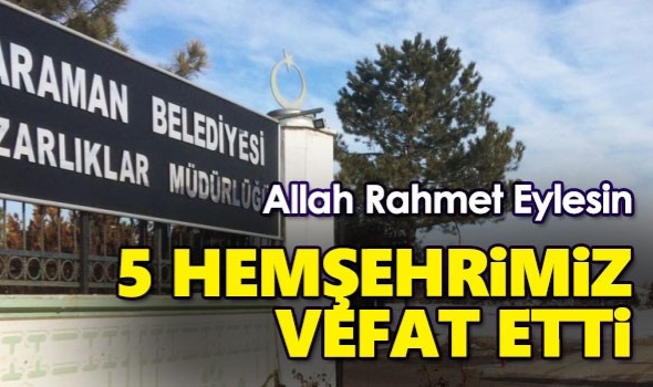Karaman’da bugün vefat eden merhumelere Allah’tan rahmet yakınlarına bağ sağlığı diliyoruz.ABİDİN KARADUMANAslen Karamanlı olup Çeltek mahallesinde ikamet etmekte olan Abidin Karaduman (49) vefat etmiştir. Cenazesi 16 Kasım Çarşamba günü öğle namazına müteakip Kazalpa mezarlığından kaldırılacaktır.AYŞE YÜCELAslen Karamanlı olup Beyazkent mahallesinde ikamet etmekte olan Ayşe Yücel (89) vefat etmiştir. Cenazesi 16 Kasım Çarşamba günü öğle namazına müteakip Musalladan kaldırılacaktır.BAYRAM GÖKTEKİNAslen Karacaören köyünden olup Larende mahallesinde ikamet etmekte olan Bayram Göktekin (84) vefat etmiştir. Cenazesi 16 Kasım Çarşamba günü öğle namazına müteakip Musalladan kaldırılacaktır.DURMUŞ ALİ DAŞAslen Yılangümü köyünden olup Topucak mahallesinde ikamet etmekte olan Durmuş Ali Daş (67) vefat etmiştir. Cenazesi 16 Kasım Çarşamba günü öğle namazına müteakip Musalladan kaldırılacaktır.MUHSİN YILDIZAslen Karamanlı olup Sümer mahallesinde ikamet etmekte olan Muhsin Yıldız (72) vefat etmiştir. Cenazesi 16 Kasım Çarşamba günü öğle namazına müteakip Musalladan kaldırılacaktır.