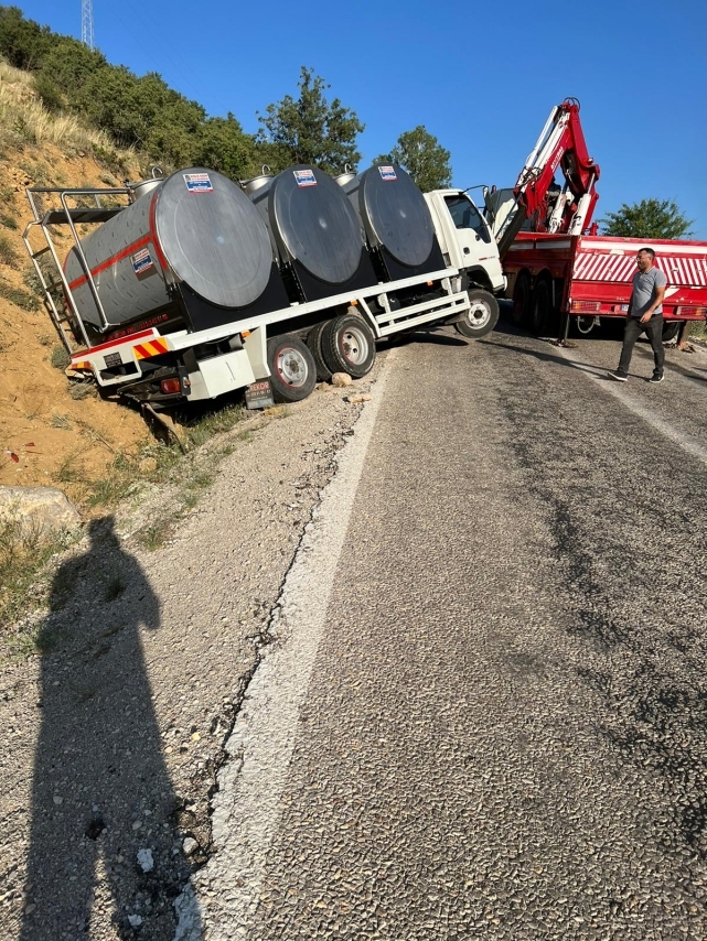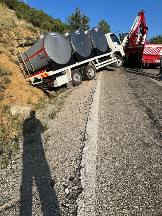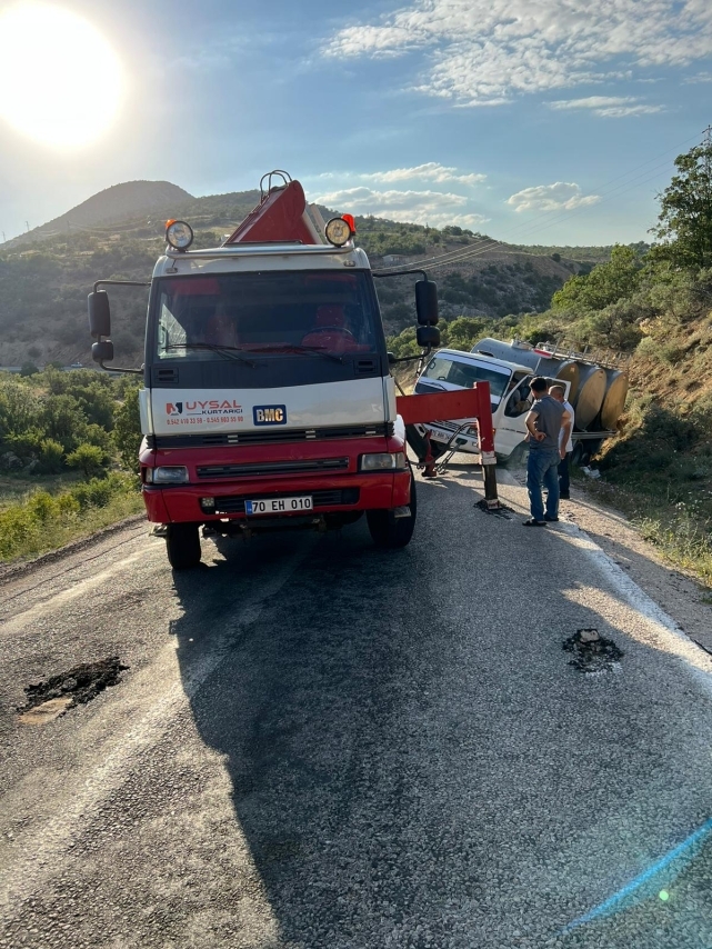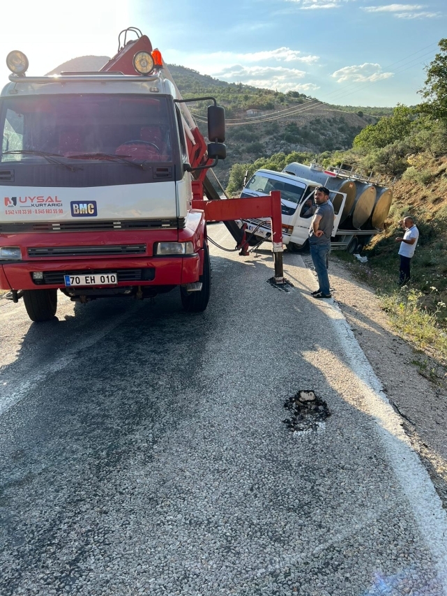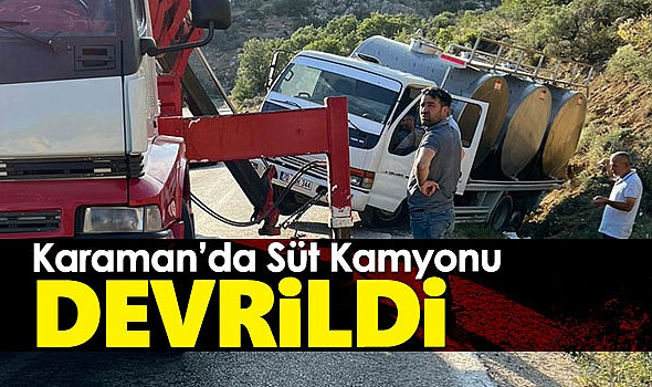 Karaman'da meydana gelen kazada süt kamyonu devrildi.