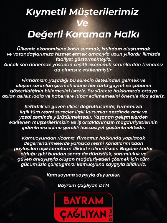 Açıklamada, firmanın uzun yıllardır Karaman’da faaliyet gösterdiği, ülke ekonomisine katkı sunmak ve istihdam oluşturmak amacıyla hizmet verdiği belirtilerek, son dönemde yaşanan ekonomik sorunların işletmeyi de olumsuz etkilediği vurgulandı. Firma yetkilisi Bayram Çağlıyan, yaşanan sürecin aşılması ve oluşan sorunların giderilmesi adına her türlü çaba ve gayretin gösterildiğini ifade etti.