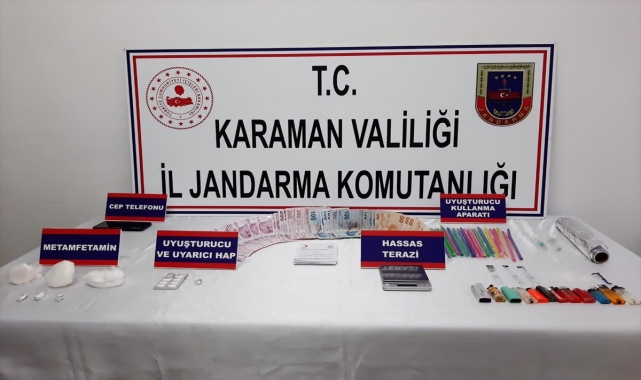 Karaman'da düzenlenen uyuşturucu operasyonunda gözaltına alınan şüpheli çıkarıldığı mahkemede tutuklandı.Karaman İl Jandarma Komutanlığına bağlı ekipler, M.T.'nin (33) Gaziantep ilinden Karaman iline uyuşturucu madde getirerek sattığı yönünde bilgi edinilmesi üzerine çalışma başlattı.Belirlenen adrese operasyon düzenleyen ekipler şüpheliyi gözaltına aldı.Zanlının yapılan üst aramasında 136.5 gram metamfetamin, 8 adet reçeteye tabi uyuşturucu hap, 1 adet hassas terazi, 3 adet bong ve payp olarak bilinen uyuşturucu madde kullanma aparatı, 30 adet uyuşturucu madde satışına ve kullanımına yarayan muhtelif malzeme ile uyuşturucu ticaretinden elde edildiği değerlendirilen 7 bin lira nakit para ele geçirildi.Jandarmadaki işlemlerinin ardından adliyeye sevk edilen şüpheli çıkarıldığı nöbetçi sulh ceza hakimliği tarafından tutuklanarak cezaevine gönderildi.