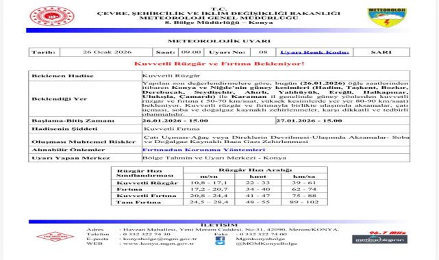 AFAD Karaman, sosyal medya üzerinden yaptığı bildirimle Karaman ve çevresindeki vatandaşları etkileyebilecek meteorolojik bir uyarı yapıldığını duyurdu. Vatandaşlar, olası olumsuz hava koşullarına karşı dikkatli olmaya çağrıldı.