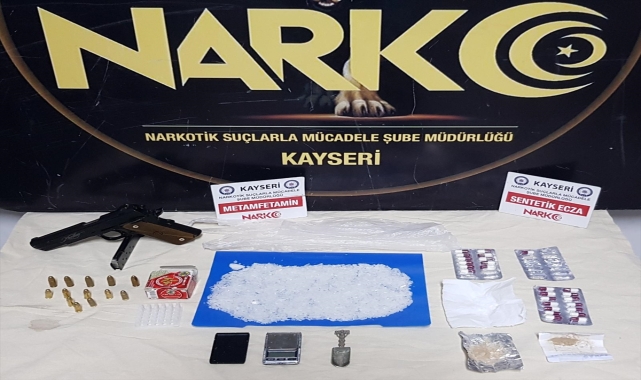 Kayseri'de polisin kovalamaca sonucu durdurduğu otomobilde uyuşturucu ele geçirildi, olayla ilgili 3 kişi gözaltına alındı.İl Emniyet Müdürlüğü Narkotik Suçlarla Mücadele Şubesi ekipleri, takibe aldıkları E.T. yönetimindeki otomobili durdurmak istedi."Dur" ihtarına uymayarak kaçan otomobil, kovalamaca sonucu durduruldu.Polis ekipleri, aracın kapılarını kilitleyen 3 şüpheliyi otomobilin camını kırarak etkisiz hale getirdi.Araçta yapılan aramada, 108 gram sentetik uyuşturucu, 2 gram eroin, hassas terazi, 26 uyuşturucu hap, uyuşturucu tartımında kullanılan ölçek kaşık, ruhsatsız tabanca ve 13 fişek ele geçirildi.