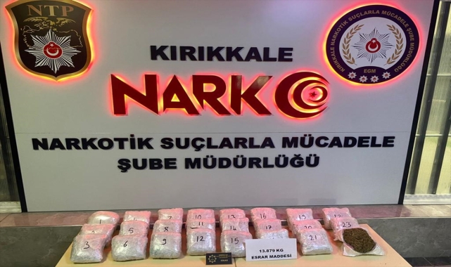 Kırıkkale'de kargo aracında giysilerin içerisine zulalanmış 13 kilo 800 gram kubar esrar ele geçirildi, gözaltına alınan şüpheli tutuklandı.İl Emniyet Müdürlüğü Narkotik Suçlarla Mücadele Şubesi ekipleri, bir kargo firmasına ait kamyonla doğu illerinden batı illerine uyuşturucu sevkiyatı yapılacağı bilgisine ulaştı.Cumhuriyet savcısından alınan karara istinaden Kırıkkale-Ankara kara yolu uygulama noktasında aracı durduran ekipler, yaptıkları aramada bir kutu içerisindeki giysilerin arasına zulalanmış 24 paket halinde 13 kilo 800 gram kubar esrar buldu.Gözaltına alınan sürücü, emniyetteki işlemlerinin ardından salıverildi.Uyuşturucunun alıcısının Ankara'da olduğu bilgisine ulaşan ekipler, düzenledikleri operasyonla şüpheli G.T'yi gözaltına alarak Kırıkkale'ye getirdi.Emniyetteki işlemlerinin ardından adliyeye sevk edilen zanlı, çıkarıldığı hakimlikçe tutuklandı.