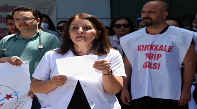 KIRIKKALE (AA) - Kırıkkale'de Hekim-Sen, Hekim Birliği ve Tabip-Sen üyeleri 1 günlük iş bırakma eylemi yaptı.Hekim-Sen Kırıkkale Temsilcisi Dr. Neslihan Şebin, Yüksek İhtisas Hastanesi poliklinik önünde grup adına yaptığı basın açıklamasında, Kovid-19 salgını döneminde hayatını kaybeden hekim ve sağlık çalışanlarına rahmet diledi.Hekimler olarak günlerce iş bıraktıklarına dikkati çeken Şebin, "Ne istediğimizi anlattık ve anlaşıldık, bundan eminiz. Lakin ısrarla görmezden, duymazdan gelinmeye çalışılıyoruz. Bizler çığırtkan bir grup değiliz. Bizler bu mesleğin kutsallığına ölesiye inandık. Hekim arkadaşlarımızın hiç şüphesi olmasın ki bu mücadeleyi kazanacağız." diye konuştu.Sendika üyeleri, basın açıklamasının ardından dağıldı.