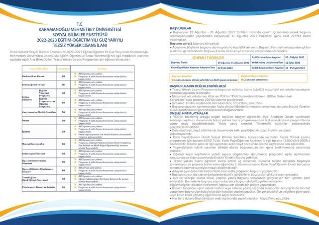 Lisansüstü programların ilanlarına başvurular http://basvuru.kmu.edu.tr/ adresinden yapılabilecek. İlanlar ile ilgili ayrıntılı bilgiye https:// kmu.edu.tr/sbe adresinden ulaşılabiliyor.