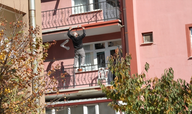 KONYA Konya'da, çatıda kiremitlerin üzerine yüzüstü uzanarak dış cephe boyası yaparken görüntülenen sıva ustası, bu kez de balkonda demir korkuluğun üzerinde boya yaptı.52 yaşındaki sıva ustası Ali Elmalı, Evsat Mahallesi'nde 4 katlı bir apartmanın üçüncü katında balkonun demir korkuluğunun üzerine ayağıyla çıkarak üst katın balkonunun dış cephesini boyarken göründü.Mesleğini sürdürürken daha önce de iskeleden düştüğünü belirten Elmalı, "Başıma daha önce bir olay geldi, 10 yıl önce iskeleden düştüm. Ailemde sürekli bu şekilde çalışmamam gerektiğini söylüyor. Ancak onları dinlemiyorum." dedi.Apartman sakinlerinden Arif Çorum "Ben de yanında kendisine eşlik ediyorum. Bugün yine çıktık, boyadık beraber. Ben yardımcı oldum, ben uzattım, bu boyadı. Aslında yaptığımız iş tehlikeli. Binaya kuracak iskele bulamıyoruz. Usta da zaten iskele istemiyor. Hatta ben 'Kurtarıcı çağırayım.' dedim, 'Ben yaparım' dedi, katılmadı." diye konuştu.