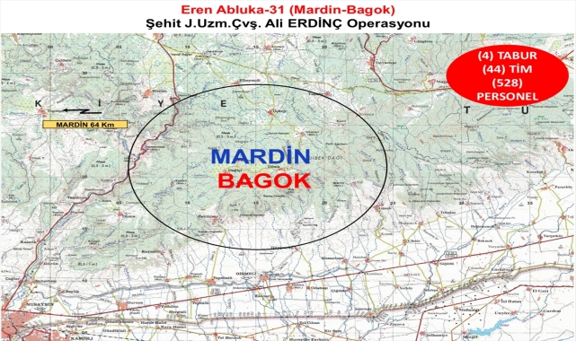 Mardin'de, 528 personelin katılımıyla Eren Abluka-31 Şehit Jandarma Uzman Çavuş Ali Erdinç operasyonu başlatıldı.İçişleri Bakanlığının yazılı açıklamasında, terör örgütü PKK'yı ülke gündeminden çıkarmak ve bölgede barındığı değerlendirilen teröristleri etkisiz hale getirmek amacıyla Mardin'de, "Eren Abluka-31 (Mardin-Bagok) Şehit Jandarma Uzman Çavuş Ali Erdinç Operasyonu"nun başlatıldığı bildirildi.Açıklamada, operasyonda İl Jandarma Komutanlığınca, 528 jandarma komando, jandarma özel harekat ve güvenlik korucu timlerinden oluşan 44 operasyonel timin görev aldığı aktarıldı.