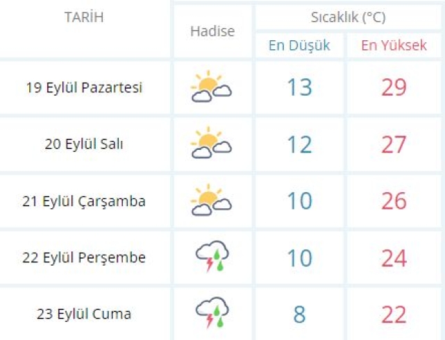 Meteoroloji Genel Müdürlüğü 8.Bölge Müdürlüğünden yapılan uyarıda şu ifadelere yer verildi: Hava Sıcaklıkları Düşüyor ve Yağışlı Hava Geliyor! "Son günlerde yurt genelinde hava sıcaklıklarının mevsim normallerinin 6 ila 10 derece üzerinde olduğu yağışsız bir hava etkili olmaktadır. Ancak sıcaklıkların 19 Eylül 2022 Pazartesiden itibaren kademeli olarak düşerek, hafta ortasından itibaren yağışlarla birlikte tüm yurtta hissedilir derecede azalacağı ve mevsim normallerinin altına gerileyeceği tahmin ediliyor.Hafta ortasına kadar ağırlıklı olmak üzere yerel olarak görülecek olan sağanak şeklindeki yağışların, haftanın ikinci yarısında yer yer kuvvetli olmak üzere görülmesi bekleniyor.Serin ve yağışlı havanın önümüzdeki hafta başına kadar etkili olacağı, hava sıcaklıklarının ise kuzey, iç ve batı bölgelerde mevsim normallerinin 4 ila 9 derece altında seyredeceği tahmin ediliyor.Ani sıcaklık değişimleri ve kuvvetli meteorolojik hadiseler ile ilgili Meteoroloji Genel Müdürlüğü’nün yayınlayacağı hava tahmin raporları ve meteorolojik uyarıların dikkatle takip edilmesi önem arz etmektedir.Başlama-Bitiş Zamanı19.09.2022 06:00 - 24.09.2022 18:00" KARAMAN 5 GÜNLÜK HAVA TAHMİN RAPORU Meteroloji Genel Müdürlüğü tarafından yayınlanan Karaman hava durumu raporuna göre;19 Eylül Pazartesi en yüksek sıcaklık 29, en düşük sıcaklık 13 derece olacak. Havanın parçalı bulutlu olması bekleniyor.20 Eylül Salı en yüksek sıcaklık 27, en düşük sıcaklık 12 derece olacak. Havanın parçalı bulutlu olması bekleniyor.21 Eylül Çarşamda en yüksek sıcaklık 26, en düşük sıcaklık 10 derece olacak. Havanın parçalı bulutlu olması bekleniyor.22 Eylül Perşembe en yüksek sıcaklık 24, en düşük sıcaklık 10 derece olacak. Havanın gökgürültülü sağanak yağmurlu olması bekleniyor.23 Eylül Cuma en yüksek sıcaklık 22, en düşük sıcaklık 8 derece olacak. Havanın gökgürültülü sağanak yağmurlu olması bekleniyor.
