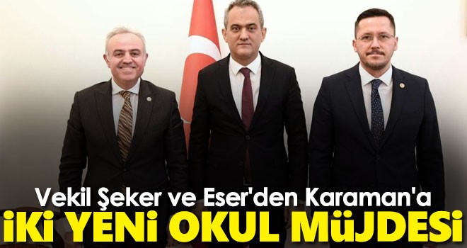 AK Parti Karaman Milletvekilleri Dr. Recep Şeker ve Av. Selman Oğuzhan Eser’den Karaman ve Sarıveliler’e yeni okul müjdesi geldi.Milletvekilleri yaptığı açıklamada;“Milli Eğitim Bakanımız Sayın Prof. Dr. Mahmut ÖZER ile görüşmemizde iletmiş olduğumuz taleplerimizden sevinçli haber geldi.Karaman Merkez Yunus Emre Mahallesinde nüfusun hızla arttığı yeni TOKİ’ler mevkiine 32 derslikli 40 Milyon TL proje bedelli, Sarıveliler ilçemize 12 derslikli 16 Milyon 500 Bin TL proje bedelli olmak üzere ilimize iki tane yeni okul yapılacak.Yeni yapılacak okulların en kısa sürede bitirilerek vatandaşlarımızın hizmetine sunulması temennisi ile Karaman’ımıza hayırlı uğurlu olmasını diler, başta Cumhurbaşkanımız Sayın Recep Tayyip ERDOĞAN olmak üzere, Milli Eğitim Bakanımız Sayın Prof. Dr. Mahmut ÖZER’e ve tüm emeği geçenlere şükranlarımızı sunarız.” dediler.