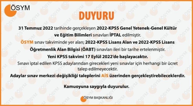 ÖSYM'nin sosyal medya hesabından yayımlanan duyuruda, 31 Temmuz 2022'de gerçekleşen 2022-KPSS Genel Yetenek-Genel Kültür ve Eğitim Bilimleri sınavlarının iptal edildiği, ÖSYM sınav takviminde yer alan 2022-KPSS Lisans Alan ve 2022-KPSS Lisans Öğretmenlik Alan Bilgisi (ÖABT) sınavlarının ileri bir tarihe ertelendiği anımsatıldı.YENİ SINAVLAR İÇİN HERHANGİ BİR ÜCRET TALEP EDİLMEYECEKYeni KPSS takviminin 17 Eylül 2022'de başlayacağı belirtilen duyuruda, sınavı iptal edilen KPSS adaylarından girecekleri yeni sınavlar için herhangi bir ücret talep edilmeyeceği kaydedildi.SINAV MERKEZI DEĞİŞİKLİĞİ TALEPLERİ AİS ÜZERİNDEN YAPILACAKDuyuruda, adayların sınav merkezi değişikliği taleplerini AİS üzerinden gerçekleştirebileceği bildirildi.