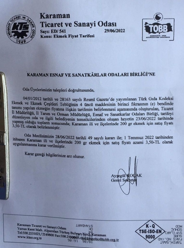 Ekmek fiyatlarında bir indirimin söz konusu olmadığını belirten Karaman Esnaf ve Sanatkârlar Odaları Birliği Başkanı Selahaddin Pekoğlu açıklamasında, ‘’Geçtiğimiz günlerde alınan karar doğrultusunda ilimizde, 1 Temmuz itibariyle 200 gram ekmek için 3 lira 50 kuruş şeklinde fiyat belirlemesi yapılmıştır. Ekmek satış noktalarına tebliğ edilen bu fiyatta herhangi bir indirim söz konusu değildir. Bazı oda başkanlarımızın, dedikodu diye tabir edeceğimiz ‘indirim’ konusunu teyit etmeksizin üyelerine mesaj olarak gönderdikleri ortaya çıkmıştır. Bu mesajların bir ekmek satış noktası üzerinden internet sitesine servis edildiği ve bu sitenin de mesajın doğruluğunu teyit etmeden haberleştirdiği bir durum yaşanmıştır.Bu konuda ne Fırıncılar Odası’nın nede Esnaf Sanatkârlar Odaları Birliği’nin ‘Ekmeğe indirim’ yapıldığı yönünde beyanı, açıklaması veya üyelerine bildirimi olmamıştır. Aynı zamanda ne Fırıncılar Odası’ndan nede KESOB’dan görüşte alınmamıştır. Kaynağından öğrenilmeyen bilgi, halkın yanlış yönlendirilmesine neden olduğundan; ister internet sitesi, ister oda başkanı veya sosyal medya fenomeni olmak üzere herkesin duyarlı olması gerekmektedir. Tekraren belirtmek gerekirse, ilimizde 200 gramlık ekmeğin 3 lira 50 kuruş olan fiyatında bir değişiklik yoktur. Bunun aksi yönündeki mesaj, açıklama veya haberler kesinlikle asılsızdır ve itibar edilmemelidir’’ sözlerine yer verdi.