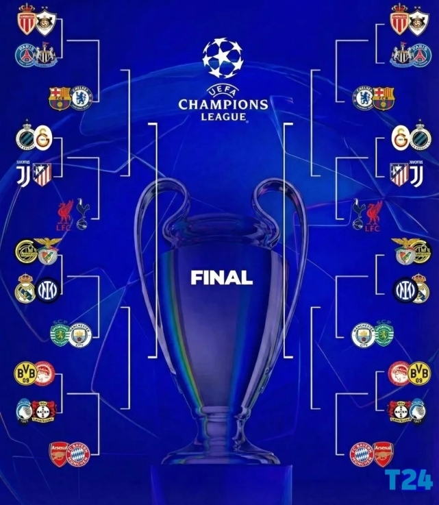 Lig etabının sona ermesinin ardından ilk 8'de yer alan Arsenal, Bayern Münih, Liverpool, Tottenham, Barcelona, Chelsea, Sporting ve Manchester City, doğrudan son 16 turuna yükseldi.Puan cetvelinde 9-24. sırayı elde eden Real Madrid, Inter, Paris Saint-Germain (PSG), Newcastle United, Juventus, Atletico Madrid, Atalanta, Bayer Leverkusen, Borussia Dortmund, Olympiakos, Club Brugge, Galatasaray, Monaco, Karabağ, Bodo/Glimt ve Benfica, adlarını play-off aşamasına yazdırdı.Play-off turunda karşı karşıya gelecek 16 takım, çift maçlı eleme usulüyle son 16 biletini almaya çalışacak.