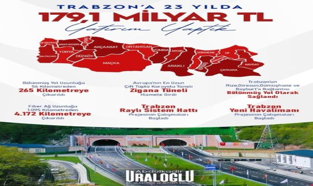Ulaştırma ve Altyapı Bakanı Abdulkadir Uraloğlu, Trabzon'a son 23 yılda 179,1 milyar TL'lik yatırım yapıldığını açıkladı. Bölünmüş yol ve fiber ağ uzunluklarındaki artışlar ile Zigana Tüneli ve yeni havalimanı projesinin detayları paylaşıldı.