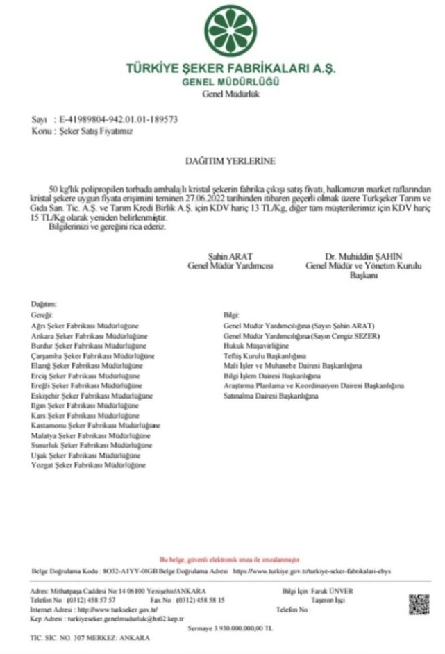 Türkiye Şeker Fabrikaları A.Ş. Genel Müdürü ve Yönetim Kurulu Başkanı Mücahit Alkan, piyasalarda dengeyi sağlayamadığı gerekçesiyle görevden alınmış yerine Muhittin Şahin atanmıştı.İTHAL ŞEKERDEN VERGİ ALINMAMASI KARARI DA ALINMIŞTISon bir yılda şekerin kilosu 6.5 TL’den 24 TL’ye, çuvalı yaklaşık 220-250 TL’den 1.100 TL’ye yükseldi. Özellikle Nisan ayından Mayıs ayına yansıtılan 2 kat fiyat artışlarını aşağı çekebilmek için geçen ay 400 bin ton kamış veya şeker pancarı ithalatından vergi alınmaması kararı alınmıştı.ŞEKERE ZAMTarım yazarı Ali Ekber Yıldırım, Türk Şeker'in büyük oranda zam yaptığını açıkladı.Zammı sosyal medya hesabından duyuran Yıldırım, Türkiye Şeker Fabrikaları Genel Müdürlüğü'nün zam kararını paylaşarak şu ifadelere yer verdi:"Şekere büyük zam. Türk Şeker, Tarım Kredi ve bazı marketlere ucuza sattığı şekere % 67, diğerlerine % 37 zam yaptı. Kristal sekerin fabrika satış fiyatı 27 Haziran itibariyle 50 kg.şeker Tarım Kredi vb. marketlere 390 TL’den 650 TL’ye, diğerleri için 550 TL’den 750 TL’ye çıktı "