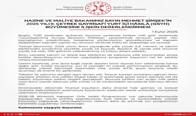 Hazine ve Maliye Bakanlığı, Türkiye Cumhuriyeti İstatistik Kurumu (TÜİK) tarafından açıklanan verilere göre, 2025 yılının ikinci çeyreğinde Gayrisafi Yurt İçi Hasıla (GSYH) büyümesinin yıllık bazda %4,8, mevsim ve takvim etkilerinden arındırılmış çeyreklik bazda ise %1,6 olduğunu duyurdu. Bakanlığın açıklamasında, ilk yarıyıl büyümesinin ise yıllık %3,6 olduğu belirtildi. Milli gelir ise yıllıklandırılmış 1,5 trilyon dolara yaklaştı.Bakanlık açıklamasında, TÜİK tarafından yapılan revizyonun, veri kaynaklarının iyileştirilmesi, hesaplama yöntemlerinin güncellenmesi ve kapsam değişiklikleri kaynaklı olduğu, ancak serilerde köklü bir değişikliğe yol açmadığı vurgulandı.
