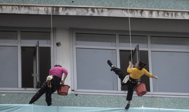 ANKARA (AA) - Fransız performans sanatçı grubu Les Passagers, 35 metre yükseklikte resim, dans ve müzikle gerçekleştirdiği performansıyla başkentlilere görsel şölen sundu.Başkent Kültür Yolu Festivali kapsamında Ankara'ya gelen Les Passagers, Ulus Meydanı'nda bulunan binada, 35 metre yükseklikte gösteri yaptı.Festival logosunda yer alan başkentin sembol mekanlarını resmeden "uçan ressamlar", daha sonra izleyenlerin heyecanlı ve meraklı bakışları arasında binadan sarkıtılan ipler üzerinde dans gösterisi yaptı.Başkentliler gösteriyi meraklı gözlerle izledi, video ve fotoğraf çekti.Dünyanın dört bir yanında performanslar sergileyen ve yüksek binaları dev bir tuvale dönüştüren Les Passagers, binaları dikey bir sahne gibi kullanarak teatral, koreografi ve resimsel performans sergiliyor.- "Ankara'da olmaktan memnunuz"Gösterinin ardından basın mensuplarına açıklamalarda bulunan grup üyesi Magali Brito, festival kapsamında Ankara'da olmaktan duyduğu memnuniyeti dile getirdi.Havada akrobasi olarak da bilinen "aerial dans" yaptıklarını belirten Brito, yüksek yerlerde performanslar sergilediklerini kaydetti.