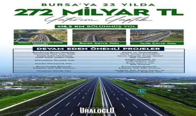 Gebze-Orhangazi-İzmir Otoyolu gibi mega projeler de tamamlanarak trafiğe açıldı.Yapılan açıklamalarla birlikte Türkiye'nin ulaşım altyapısındaki hızlı gelişim vurgulanırken, özellikle Bursa'nın bu yatırımlardan büyük pay aldığı belirtildi. Bu projelerin şehrin ulaşım ağını güçlendirmesi ve bölgesel kalkınmaya katkı sağlaması hedefleniyor.